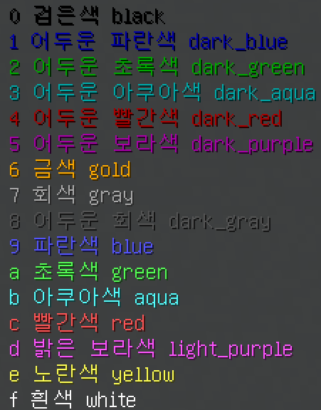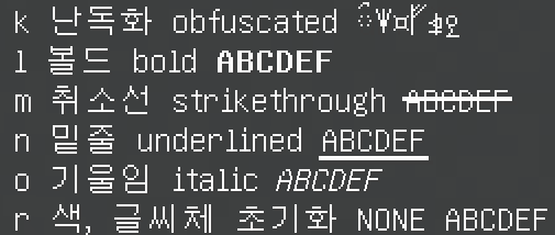 마인크래프트 해외 대규모 서버들을 플레이하다 보면 여러 가지 다양한 색을 사용한 채팅이나 볼드체 기울임체 등의 채팅이 보이는데 그 채팅들을 모두 §나 JSON을 사용하여 쓴 글자들입니다.