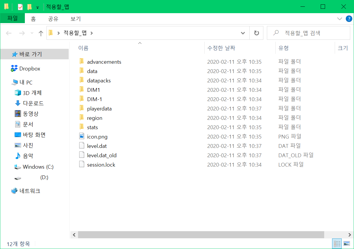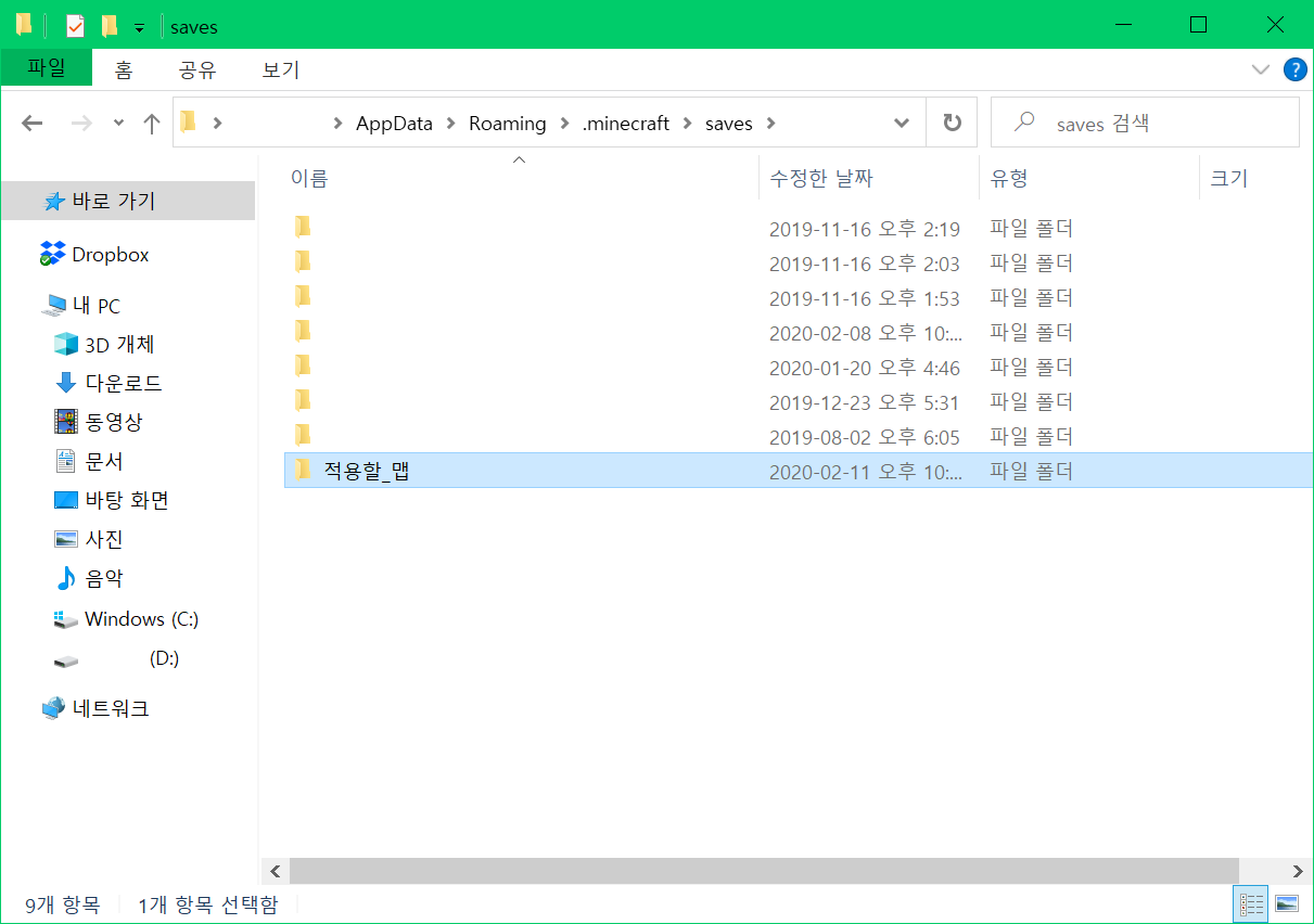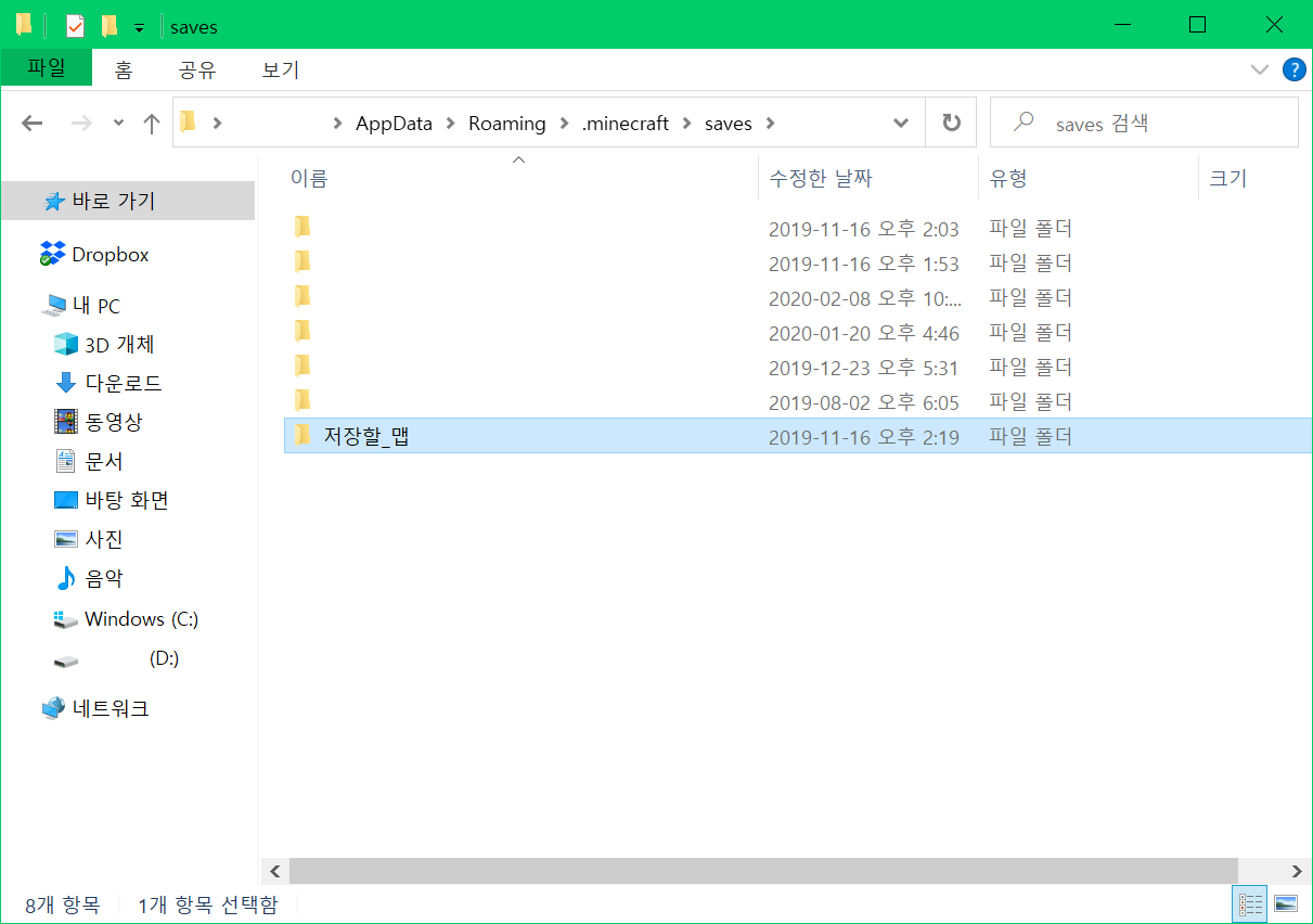 압축을 풀어 나온 맵 폴더를 맵 저장 경로로 복사해줍니다. (맵 저장 기본 경로 C:\Users\이름\AppData\Roaming\.minecraft\saves)